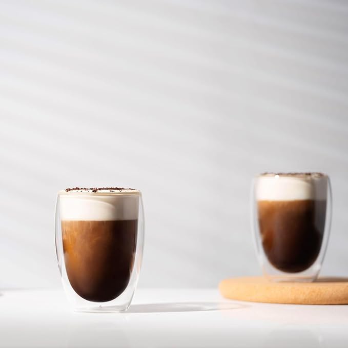 • Insulated Glass: a pack of six double-wall pavina glasses, 12 ounces each; perfect for drinking Coffee, Espresso, or a multitude of other hot and cold beverages