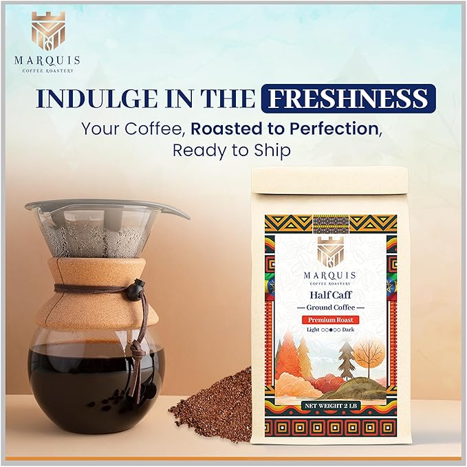 Marquis - Half Caff Ground Coffee, Rich Blend of Half Ethiopian Yirgacheffe and Half Decaf French Roast, Fresh Dark Roast with a Fruity Flavor, Premium Half Caff Coffee Ground, 2 lb