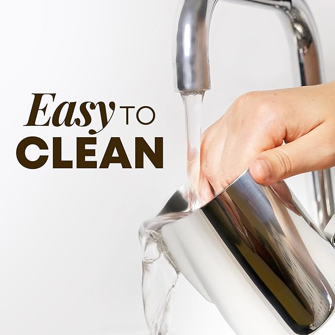 • EASY TO CLEAN: Clean this espresso milk frothing pitcher by running it under hot water with a little soap to get rid of any milk residue. Even after multiple washes, our milk pitcher for espresso machine will look as good as new and ready to add an artistic touch to your coffee. Get this stainless steel milk frothing pitcher for your friends or take it with you on trips to easily create delicious coffee drinks.