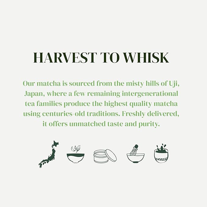 • Authentically Japanese - These matcha tea leaves are grown in our exclusive Matcha tea-farm in Uji, Japan. Our "Harvest To Whisk" program ensures freshness from our partners to you.