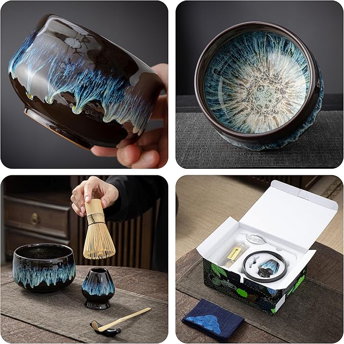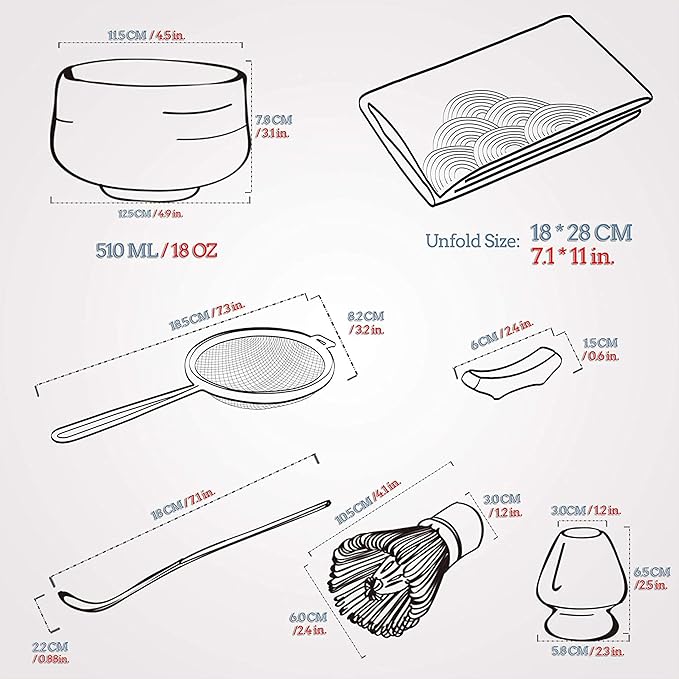 • 7-PCS MATCHA WHISK SET: 1*Ceramic Bowl (chawan) 510 Ml/18 Oz, 1*Bamboo Whisk, 1*Bamboo Scoop (chashaku), 1*Cermaic Whisk Holder, 1*Ceramic Scoop Stand, 1*Cotton Tea Cloth (chakin), 1*Matcha Powder Sifter.includes All Accessories