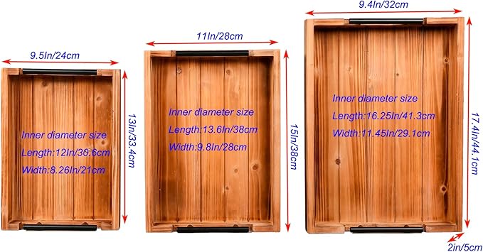 • ✅ 3 suitable sizes – each tray is ideal for different uses. the 3 trays nest inside each other, making them easy to store and saving space. dimensions: large tray – 17.5” x 12.5” medium tray – 15” x 11” small tray - 13” x 9.4”. all trays made of extra thick durable wood.