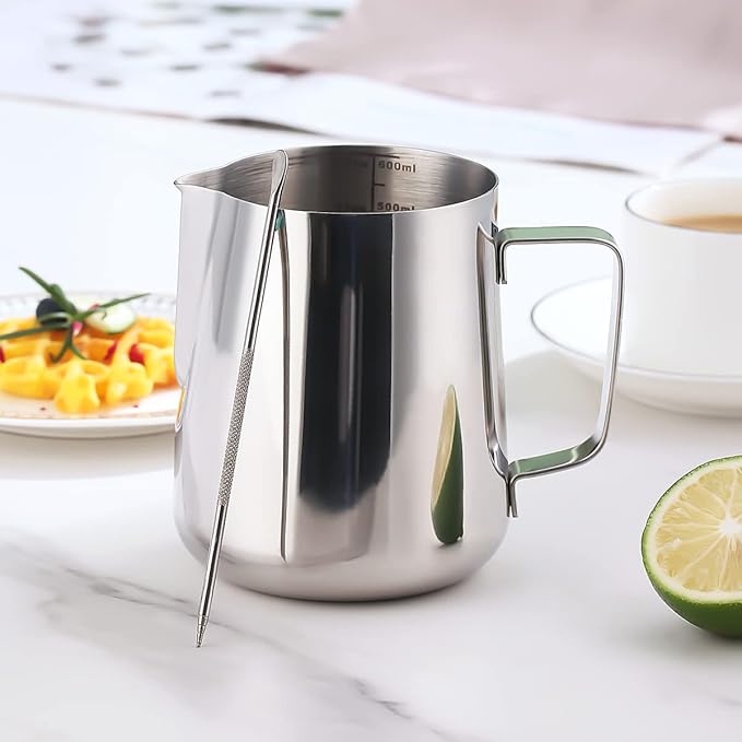 Milk Frothing Pitcher 21oz - 620ml, Kyraton Stainless Steel Espresso Steaming Pitchers with Decorating Pen,Milk Coffee Frother Cups Cappuccino Latte Art Barista Steam Pitchers Milk Jug Cup (Silver)
