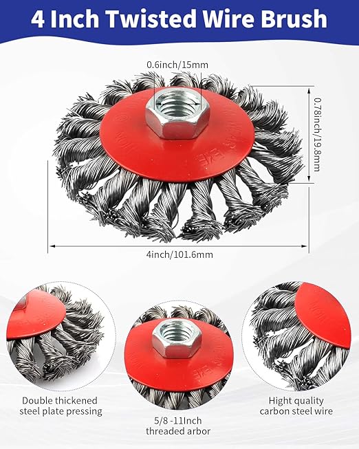 • 【WIRE BRUSHES SET】Including 4 piece 3” crimped wire cup brush, 4 piece 4” knotted wire wheel brush, which suitable for angle grinders with 5/8 -11 inch threaded shank.