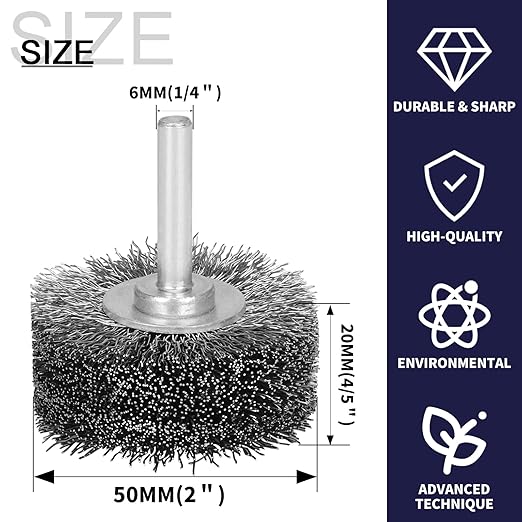 • 【0.3mm Thick Industrial Brush】Abrasive drill wire brush wheel is designed to work with die grinders to ensure seamless surface cleaning and material removal. This finishing steel brush power drill parts accessories features crimped wires with high density for maximum brushing action. The stainless steel wire of the drill brush uses 0.0118 Inch crimped steel wire. Avoid Breaks and Deformations.