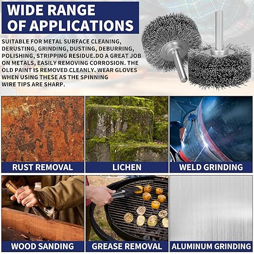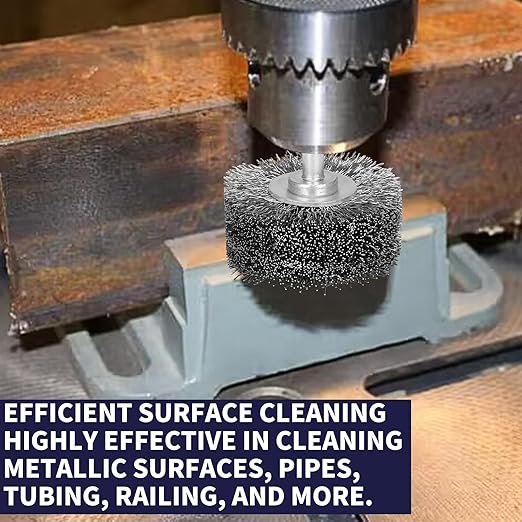 • 【Rough Treatment for The Surface】Crimped steel wire wheel is quite effective in cleaning metallic surfaces, pipes, tubing, railing, or any general-purpose cleaning. Abrasive finishing brush can remove rust, scale, and paint. Wire grinder brush for drill can be used for surface adhesion treatment before painting, spray coating and electroplating.
