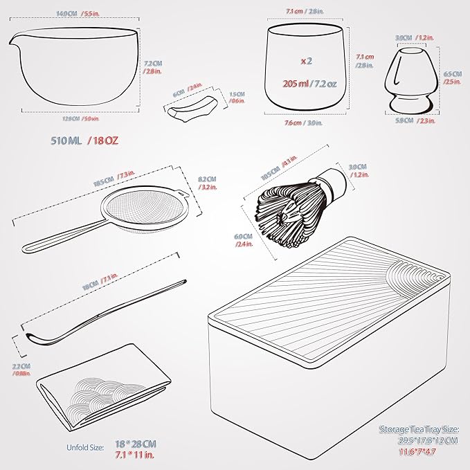 • 10-PCS MATCHA WHISK SET:1* Bamboo Whisk, 1* Bamboo Scoop (Chashaku), 1*Ceramic Bowl (Chawan) 510 ml/18 oz, 2* Ceramic Cups(7.2oz), 1* Cermaic Whisk Holder. 1* Ceramic Scoop Stand, 1* Cotton Tea Cloth (Chakin), 1* Matcha Powder Sifter, 1* Matcha Hand-Book ( 16 colorful pages) ,1* Multi-funcation Tea Tray, 1* Imitation Leather Travel Bag. .includes All Accessories