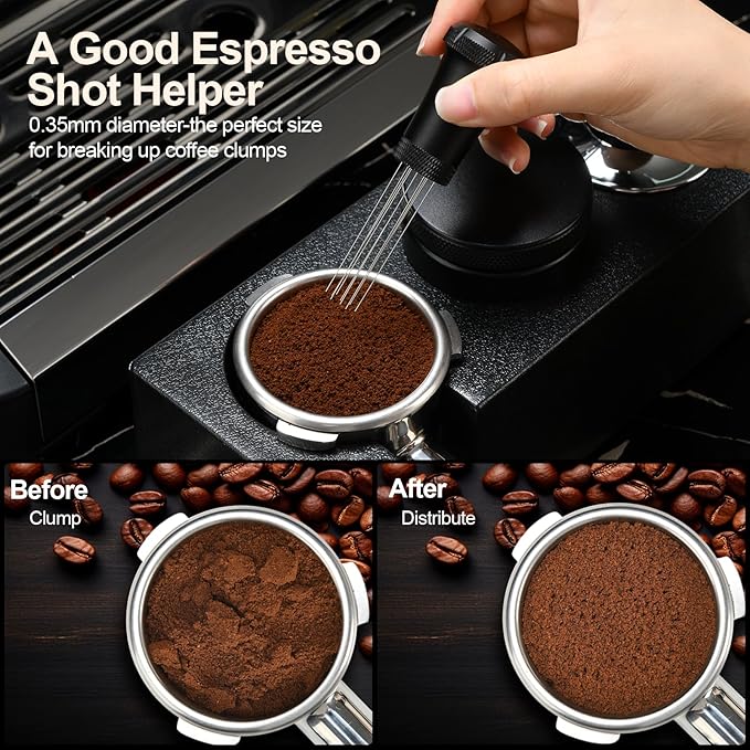 • 【A Perfect Espresso Shot Companion】 Nessus espresso distributor includes 10 food-grade stainless steel needles with a 0.35mm diameter, which is the perfect size to break up coffee clumps. For added convenience, we provide an extra set of 10 needles in a storage tube. A good choice to add this espresso machine accessories to your coffee bar!