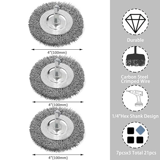 • 【Package Includes】: Total 21pcs.3 pcs 4"(100mm) wheel brush with 1/4 inch hex shank. Hardened steel wire long maximum 4500 RPM. Large-size drill wire brushes are suitable for fast work in large areas and small-size drill wire brushes are suitable for compact spaces and fine work.
