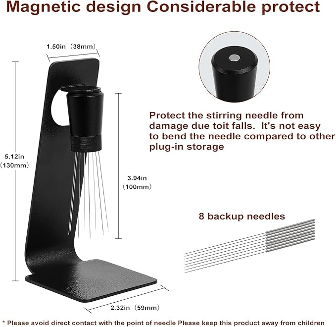 • About Coffee Distribution Stirrer: Espresso WDT Tool-Coffee Distribution Stirrer has up to 8 needles. It is designed to break up clumps,create a uniform coffee bed, and ensure a consistent density in your basket. Only 0.25mm needle promotes better extraction, resulting in a smoother espresso. The agitator is fixed on the design of the iron frame by magnetic suction, which can ensure the perfect preservation and ventilation of the mixing needle, and is not easy to deformation.