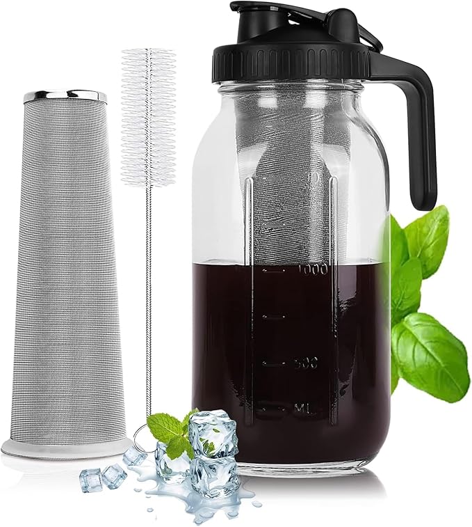 • [Complete Set] : A 64 oz mason jar pitcher with a pour spout lid, 1 stainless steel filter, and 1 cleaning brush. Ideal for daily use with ample space for ice and your favorite additives. Avoid extreme temperature fluctuations to maintain your cold brew pitcher in prime condition