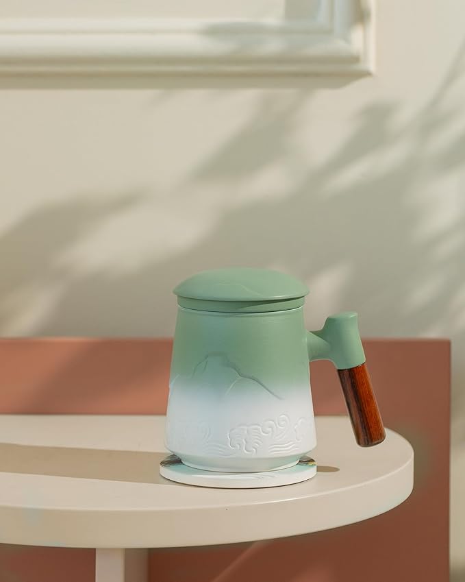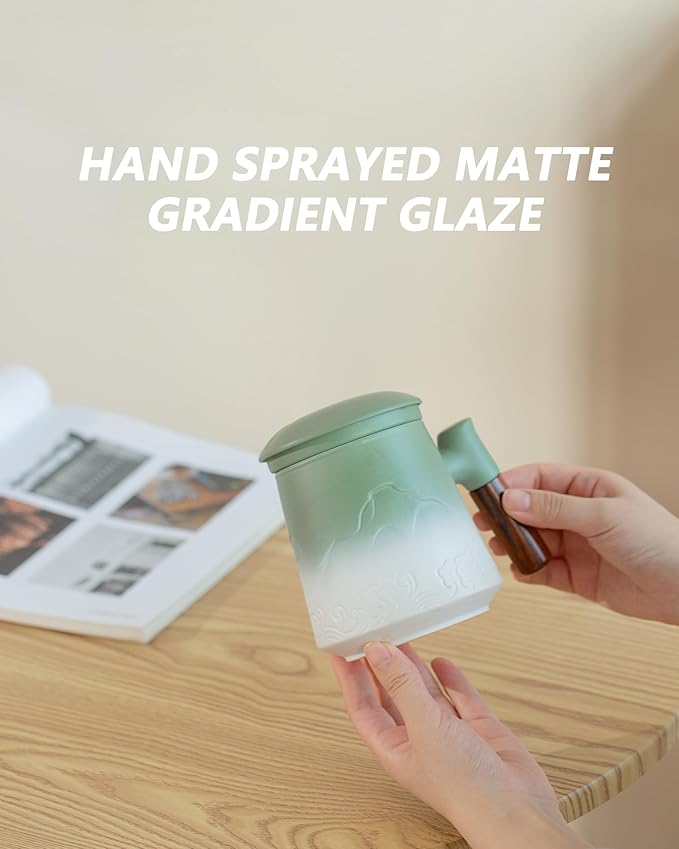 • MATTE HAND SPRAYED TEXTURED GLAZE: Zens tea infuser mug is designed by professional artists, The eye-catching gradient matcha green glazed is hand-sprayed by artisan with embossed sea view that resembles classic oriental landscape paintings. while the interior glossy glaze that makes it easy to see the color of the warm tea. The artistic wooden handle creates an aesthetic vibe, adds a vintage touch to your tea and coffee table. what a fantastic tea cup for Tea Lovers gifts.