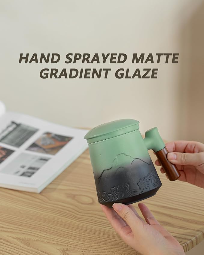 • MATTE HAND SPRAYED TEXTURED GLAZE: Zens tea infuser mug is designed by professional artists, The eye-catching gradient black and matcha green glazed is hand-sprayed by artisan with embossed sea view that resembles classic oriental landscape paintings. while the interior glossy glaze that makes it easy to see the color of the warm tea. The artistic wooden handle creates an aesthetic vibe, adds a vintage touch to your tea and coffee table. what a fantastic tea cup for Tea Lovers gifts.