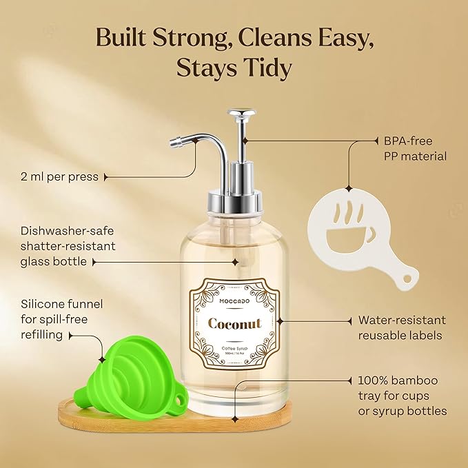 • Quality You Can Trust - Experience peace of mind knowing our glass bottles are dishwasher friendly, while our coffee syrup pump dispenser ensures precise pouring for easy coffee customization.
