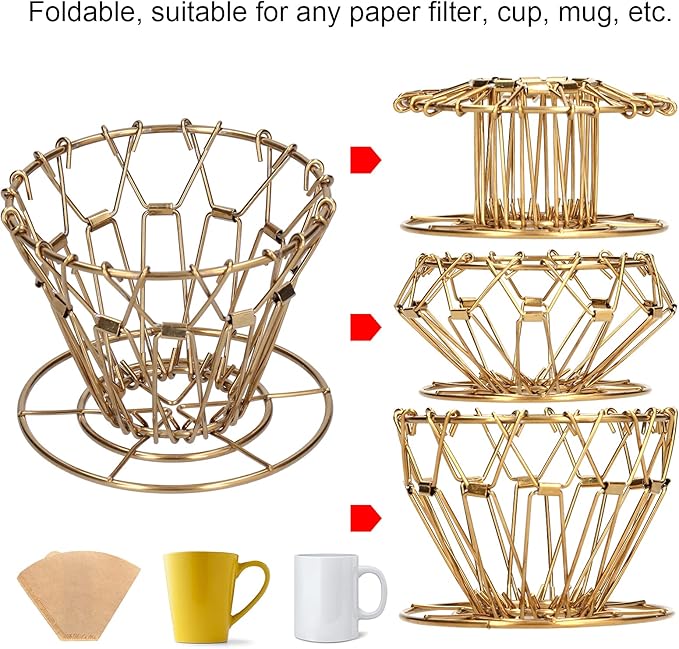 Collapsible Coffee Filter Stand, Gold Stainless Steel Pour Over Coffee Dripper Filter Holder Portable Reusable Coffee Dripper for Traveling, Camping, Hiking, Home, Office