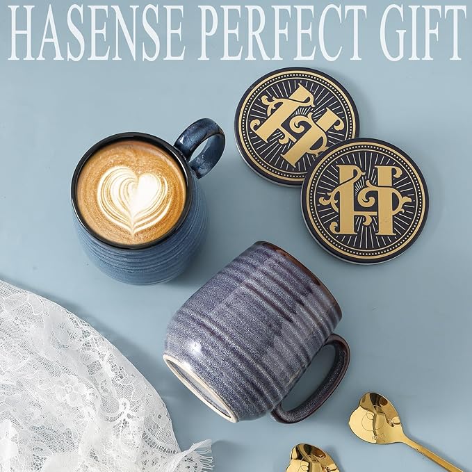 HASENSE Ceramic Coffee Mug Set, 20 Oz Tea Cups for Women and Men, Premium Large Latte Mugs with Handle, Gift Cup with Coaster & Gold Spoon for Couples, Blue & Purple