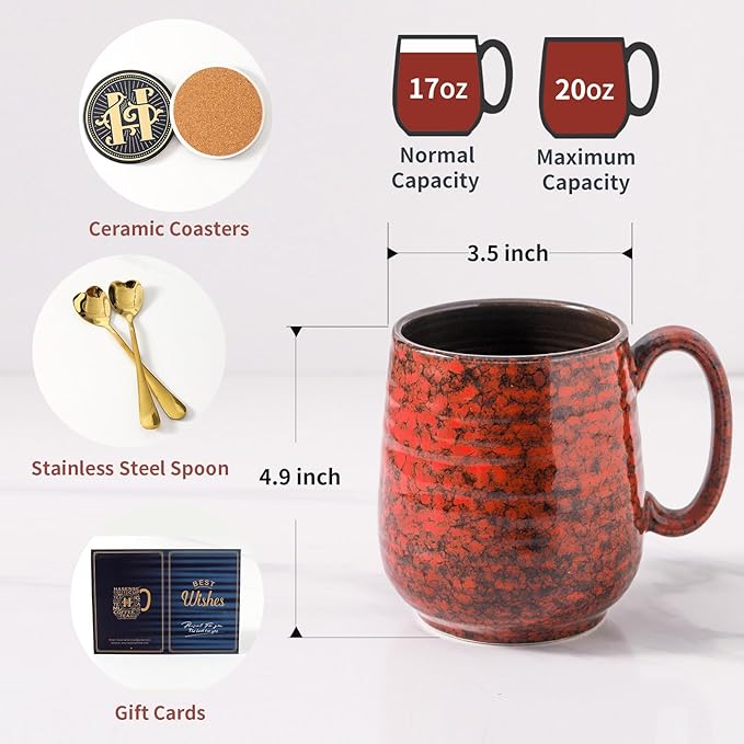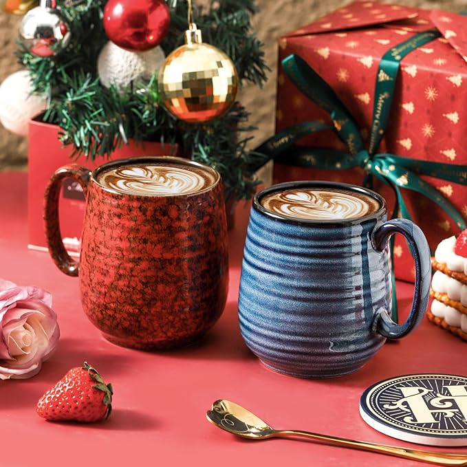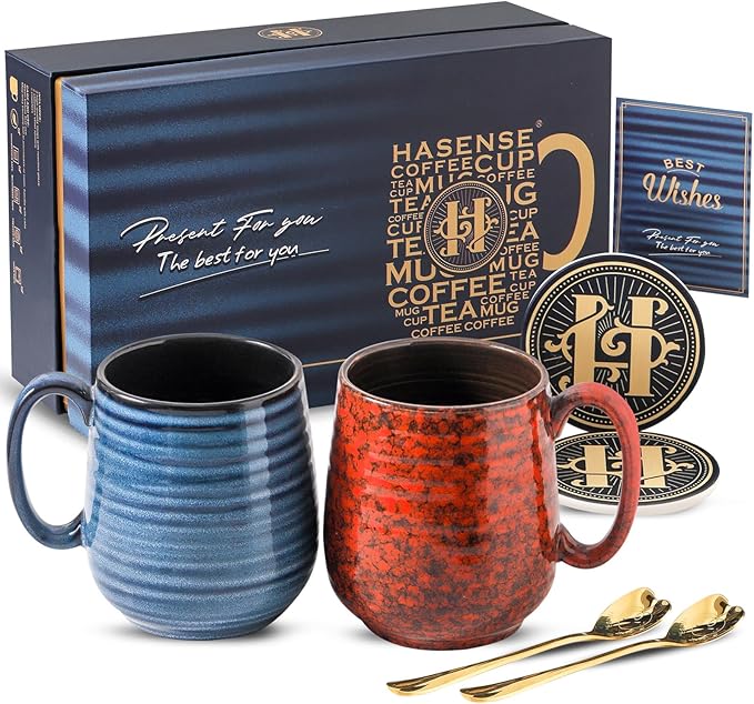HASENSE Ceramic Coffee Mug Set of 2, 20 Oz Tea Cups for Women and Men, Handmade Large Latte Mugs with Handle, Gift Box with Coaster & Gold Spoon, Perfect for Christmas Thanksgiving, Blue & Red