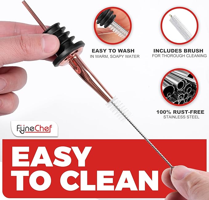 EASY TO CLEAN - Simply hand wash these bottle spout in soapy warm water, scrub with the included Brush and they'll be ready to use again. Cleaning these bar bottle pour spouts is easy. These bar pourer metal pour spouts are made of 18/8 - 304 STAINLESS STEEL, food grade material and 100% non-rust.
