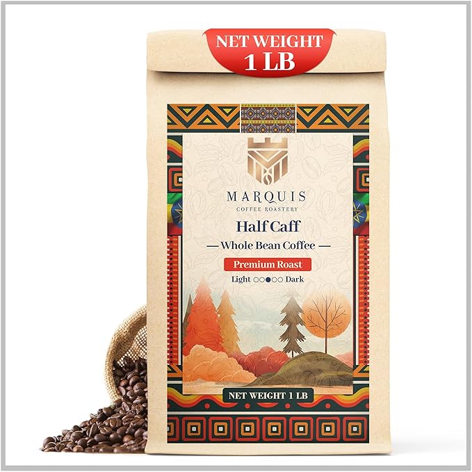 • Premium Coffee Bean Blend - Indulge in the exceptional Half Caff whole bean coffee from Marquis Coffee Roastery! Our half caff coffee is a delightful blend of our Colombian Decaf and Ethiopian Yirgacheffe coffee. Kick-start your day with the rich, fruity flavor of this whole bean dark roast coffee.