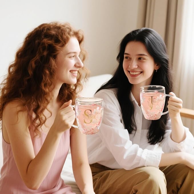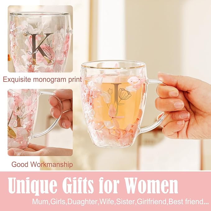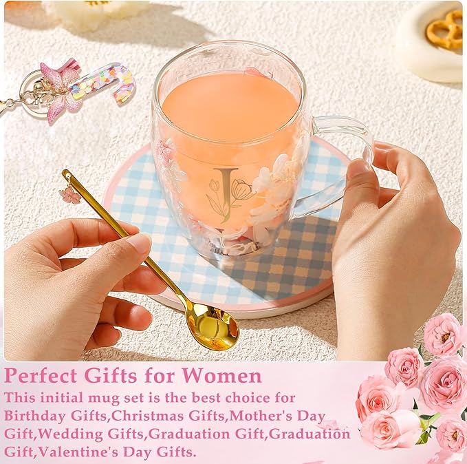 Gifts for Women Stocking Stuffers for women Flower Double Wall Glass Coffee Mug Initial Tea cup Monogrammed Customized Birthday Valentine Wedding Christmas Gift for Mom Wife Friends Sister Birde (J)