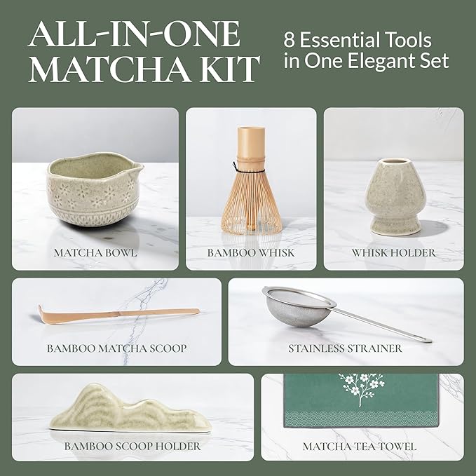 • Complete 7-Piece Set: Includes all the essentials for a traditional matcha experience – a handcrafted bamboo whisk (chasen) with ceramic holder, a ceramic matcha bowl (chawan) with easy-pour spout, a bamboo scoop (chashaku) with its rest, a fine stainless-steel sifter, and a soft tea towel (chakin). Everything you need to prepare authentic matcha at home is in one beautifully curated kit.