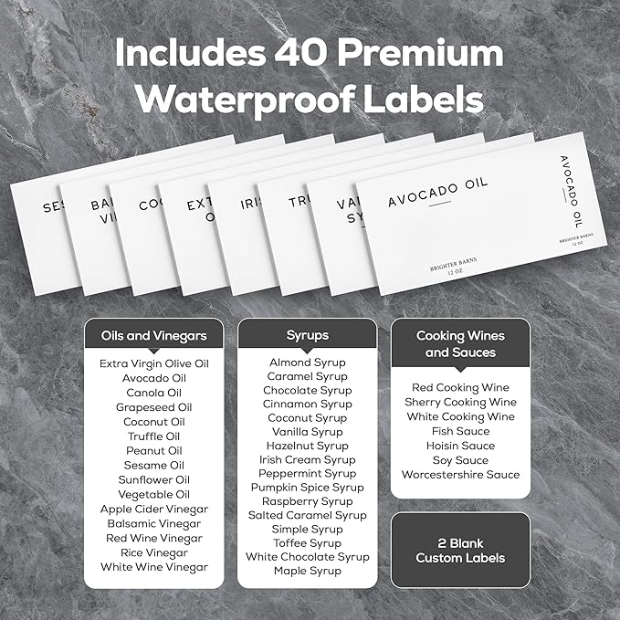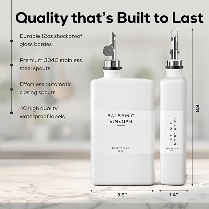 • AMERICAN DESIGN, UNCOMPROMISING QUALITY – Crafted with meticulous attention to detail, our cooking oil dispenser set features shock-resistant glass, 40 premium waterproof labels, and high-quality weighted 304 stainless steel spouts that automatically close to preserve freshness and prevent messes. All designed in the USA to provide unbeatable quality and enduring style that you can trust.