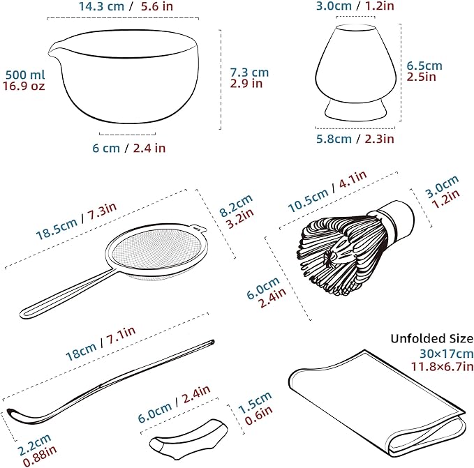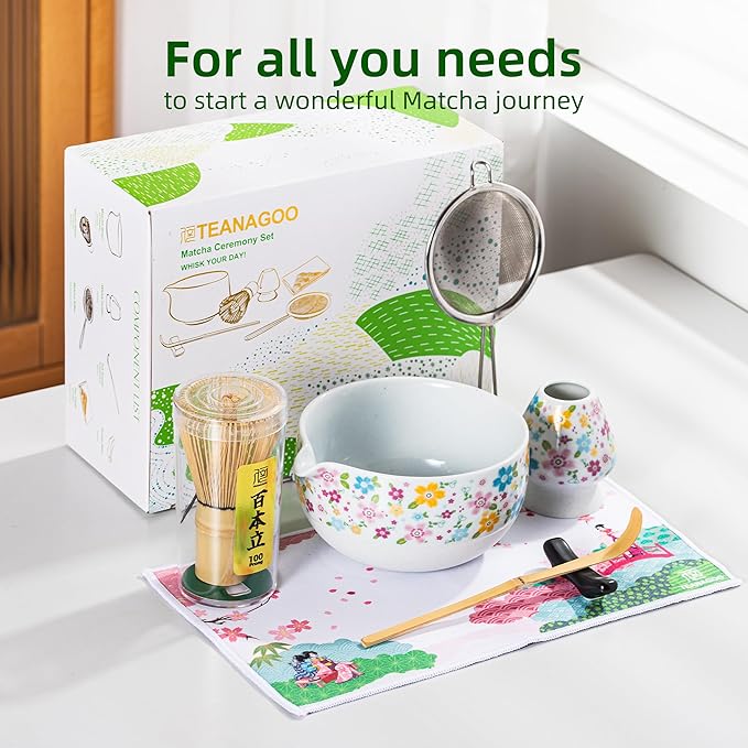 • 7-PCS MATCHA WHISK SET: 1*Ceramic Bowl (chawan) 510 Ml/18 Oz, 1*Bamboo Whisk, 1*Bamboo Scoop (chashaku), 1*Cermaic Whisk Holder, 1*Ceramic Scoop Stand, 1*Cotton Tea Cloth (chakin), 1*Matcha Powder Sifter.Includes All Accessories