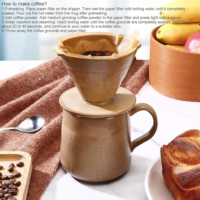 Pour Over Coffee Maker Set - 300ml Ceramic Mug with Dripper & 100 Small Cone Filters, Brown