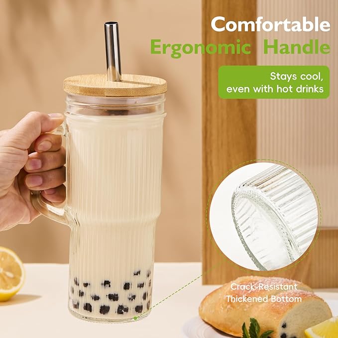 • Two Lid Options, One Easy Choice:Includes bamboo and plastic lids, plus two reusable stainless steel straws, so your glass cups are ready for smoothies, iced fruit tea, or cold brew—whatever you’re craving.