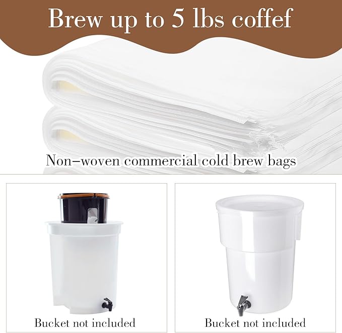 • COMMERCIAL COFFEE FILTERS: (50 pcs) Each huge cold brew filter measures 17.72" x 19.69" enough to brew up to 5 lbs of ground coffee, perfectly compatible with large 5 gallon buckets and other 5 gallon coffee sock commercial systems.Use for most occasion:family dinners, birthday parties, cafes and coffee shops.these filters are a great choice for commercial coffee filters.