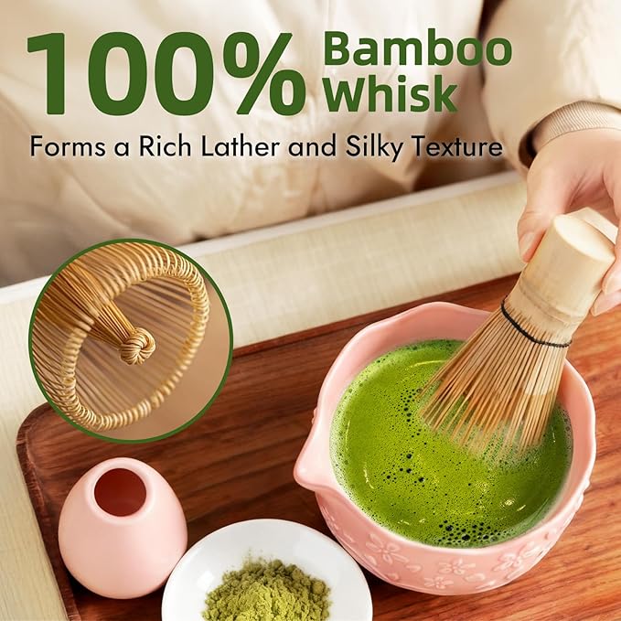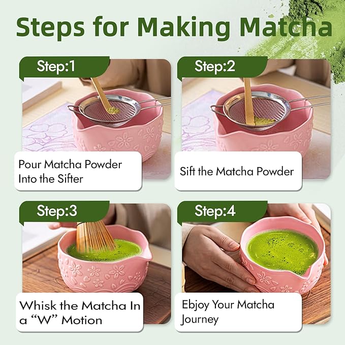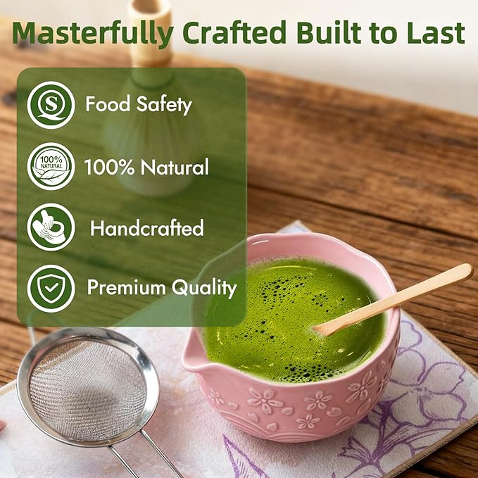 • 【Design Concept】This matcha whisk set is inspired by spring cherry blossoms. The wave design of the bowl's rim adds both personality and elegance, enhancing the artistic appeal of the entire matcha set. We have fused the delicate beauty of cherry blossoms with a natural texture, adopt the relief technique by preventing tea stains and residues from sticking, as if each petal is gracefully dancing on the ceramics bowl. This matcha kit is not only functional but also serves as a decorative piece.