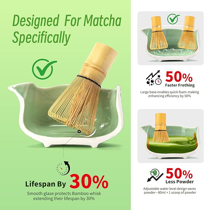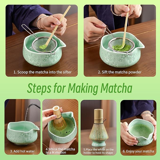 • 7-PCS MATCHA WHISK SET: 1*Ceramic Blue Green Bowl (chawan) 510 Ml/18 Oz, 1*Bamboo Whisk, 1*Bamboo Scoop (chashaku), 1*Cermaic Whisk Holder, 1*Ceramic Scoop Stand, 1*Cotton Tea Cloth (chakin), 1*Matcha Powder Sifter.includes All Accessories