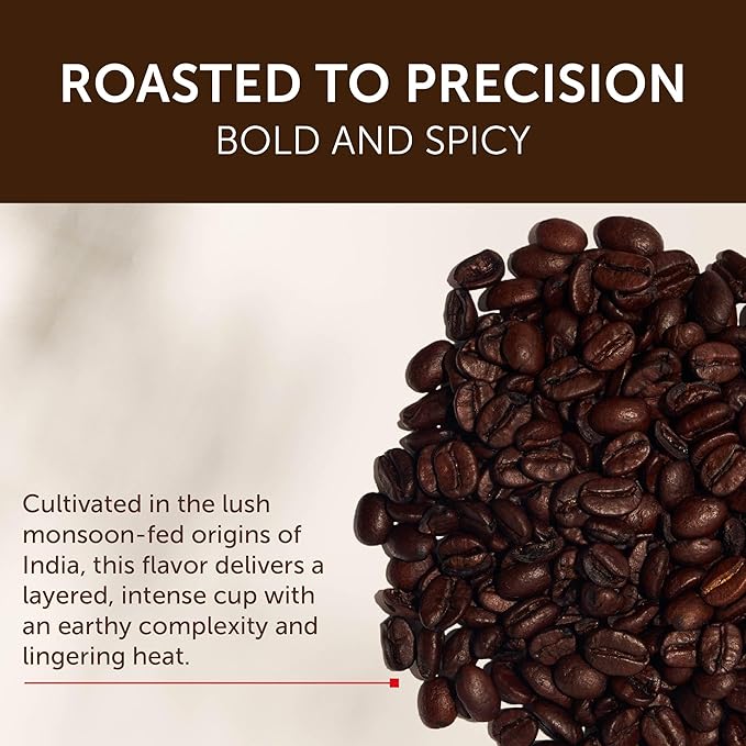 • Roasted with Precision: Sourced from the spice-rich regions of India, these coffee beans deliver bold aromatic intensity with a refined balance of strength and flavor. Distinctive notes of black pepper and extra-dark chocolate create a rich, full-bodied cup with an unforgettable finish.