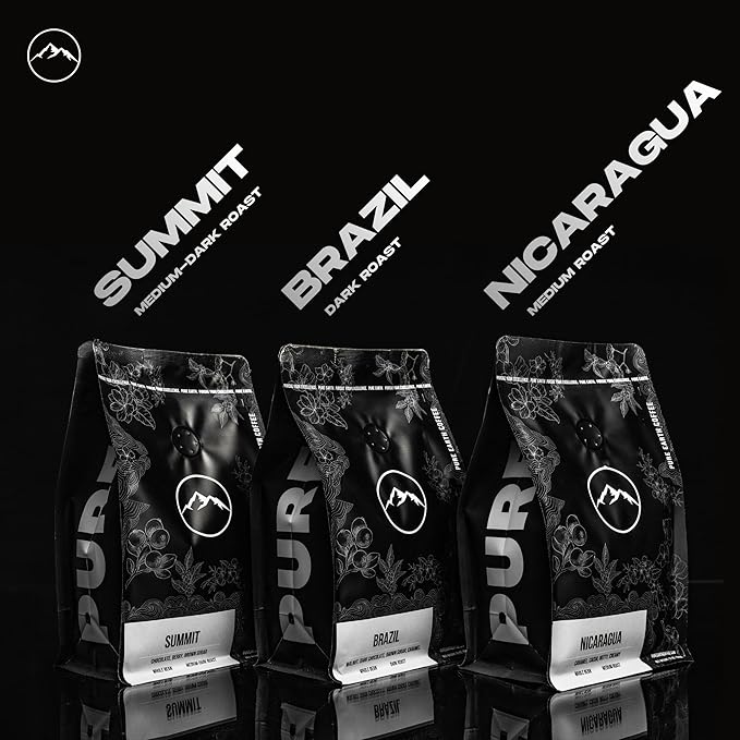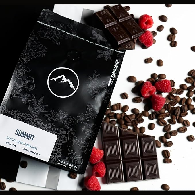 PURE EARTH COFFEE CO. Whole Bean Coffee, Summit Signature Blend, Medium Espresso Roast, Dark Chocolate, Berry, Creamy Brown Sugar 12oz