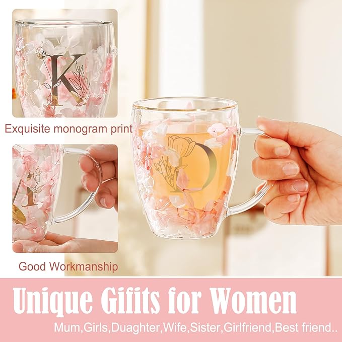 • 🌼 Perfect Birthday Gifts for Women Her: This custom initial dried flower double wall glass tumbler with spoon is a personalized gift for women, perfect for birthdays, Mother's Day, Valentine's Day, Christmas, engagement gifts, wedding anniversaries, friendship gifts,retirement gifts, thank you gifts, eid gift, graduation gifts, housewarming gift and so on. Specially designed for wives, girlfriends, best friends, sisters, aunts, grandmas and moms. The floating dried flowers create a romantic and elegant touch with every sip.