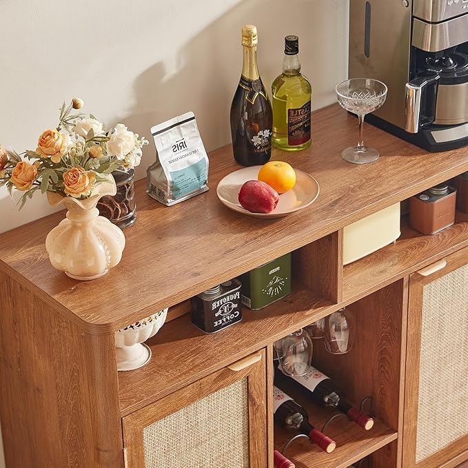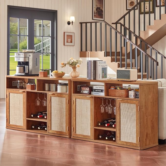 • [Stylish Rattan Mesh Doors]: The tea brown wine bar cabinet features decorative rattan mesh doors that add texture and character to your home. This thoughtful design brings a light, airy feel, making it suitable as a coffee bar cabinet in the kitchen, a whiskey cabinet for gatherings, or even a farmhouse buffet cabinet in the dining room.