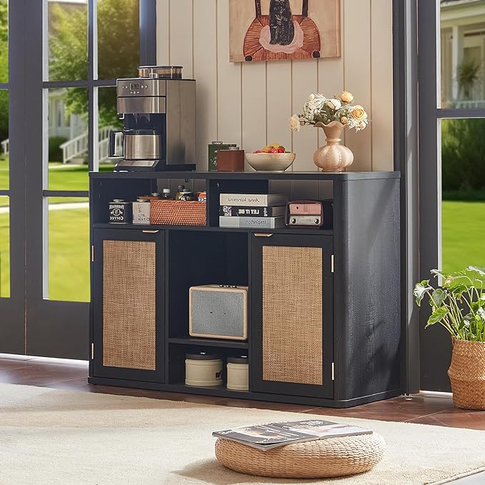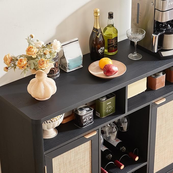 • [Stylish Rattan Mesh Doors]: The black wine bar cabinet features decorative rattan mesh doors that add texture and character to your home. This thoughtful design brings a light, airy feel, making it suitable as a coffee bar cabinet in the kitchen, a whiskey cabinet for gatherings, or even a farmhouse buffet cabinet in the dining room.