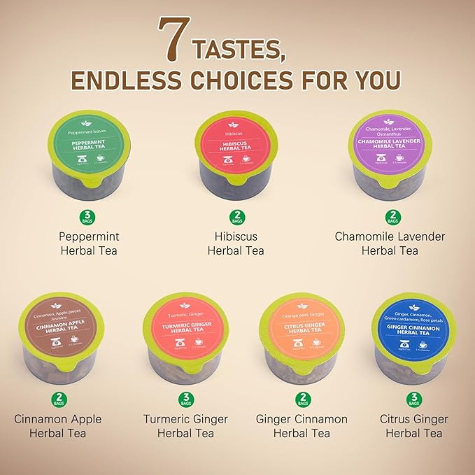 Decaf & Soothing Herbal Tea Gift Set - Relaxing Chamomile Lavender, Cinnamon Apple & Hibiscus Tea, Assorted Variety Tea Gift Set for Women, 7 Flavors, 16Pods