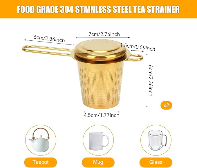 2pcs Tea Infuser, Stainless Steel Tea Strainer Fine Mesh Tea Diffuser with Double Long Handles Loose Leaf Tea Steeper for Mugs Cups Teapots (Gold)