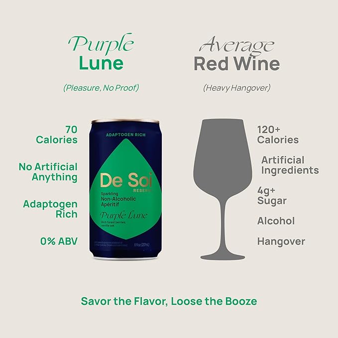 • Purple Lune - Rich & indulgent, made for winding down - A bold NA alternative to your usual evening sip, Purple Lune layers blackberry, black currant, tart cherry & vanilla oak for full-bodied flavor. Sparkling, zero-proof & crafted for the complexity of a fine pour.