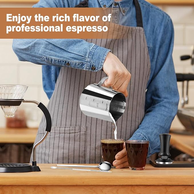 • Durable & Functional Milk Pitcher:Crafted from food-grade 304 stainless steel, this pitcher comes with an eagle-beak spout for precise pouring, an ergonomic handle for comfortable grip, and etched measurement markings to control milk volume accurately—perfect for creating smooth microfoam.