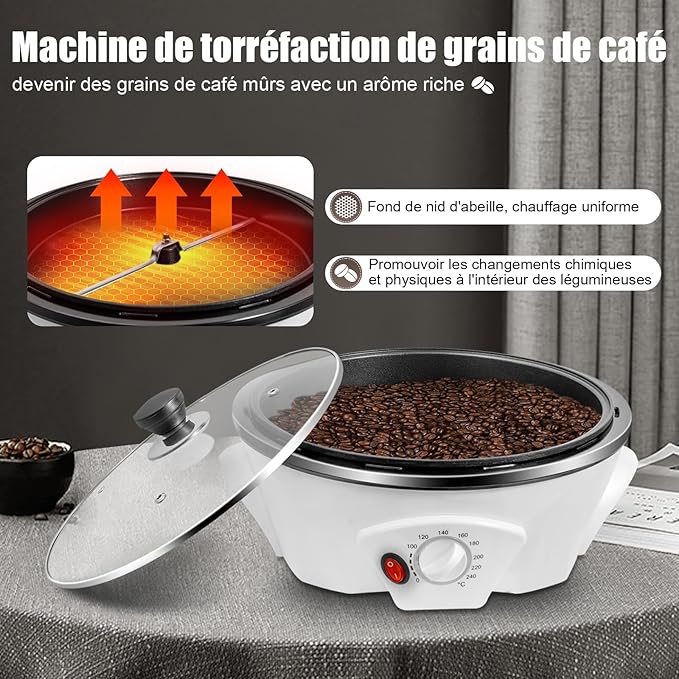 • Adjustable Temperature Control – Rotate the knob to set temperatures from 32–464℉ (0–240°C), allowing precise baking for coffee beans, peanuts, popcorn, soybeans, and other materials.